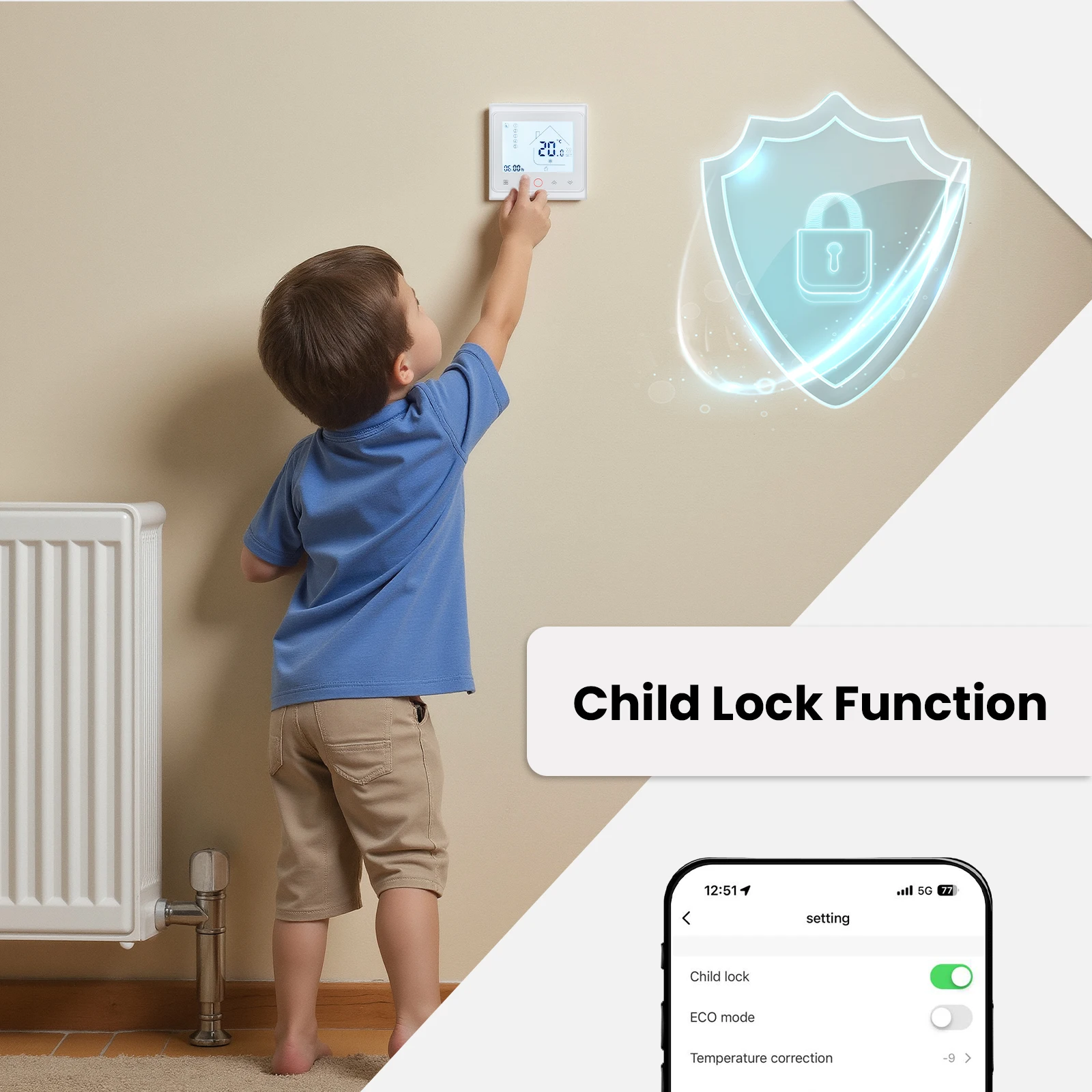 In order to avoid the danger or waste of electricity caused by children touching the switch by mistake, the child lock can be activate by App.