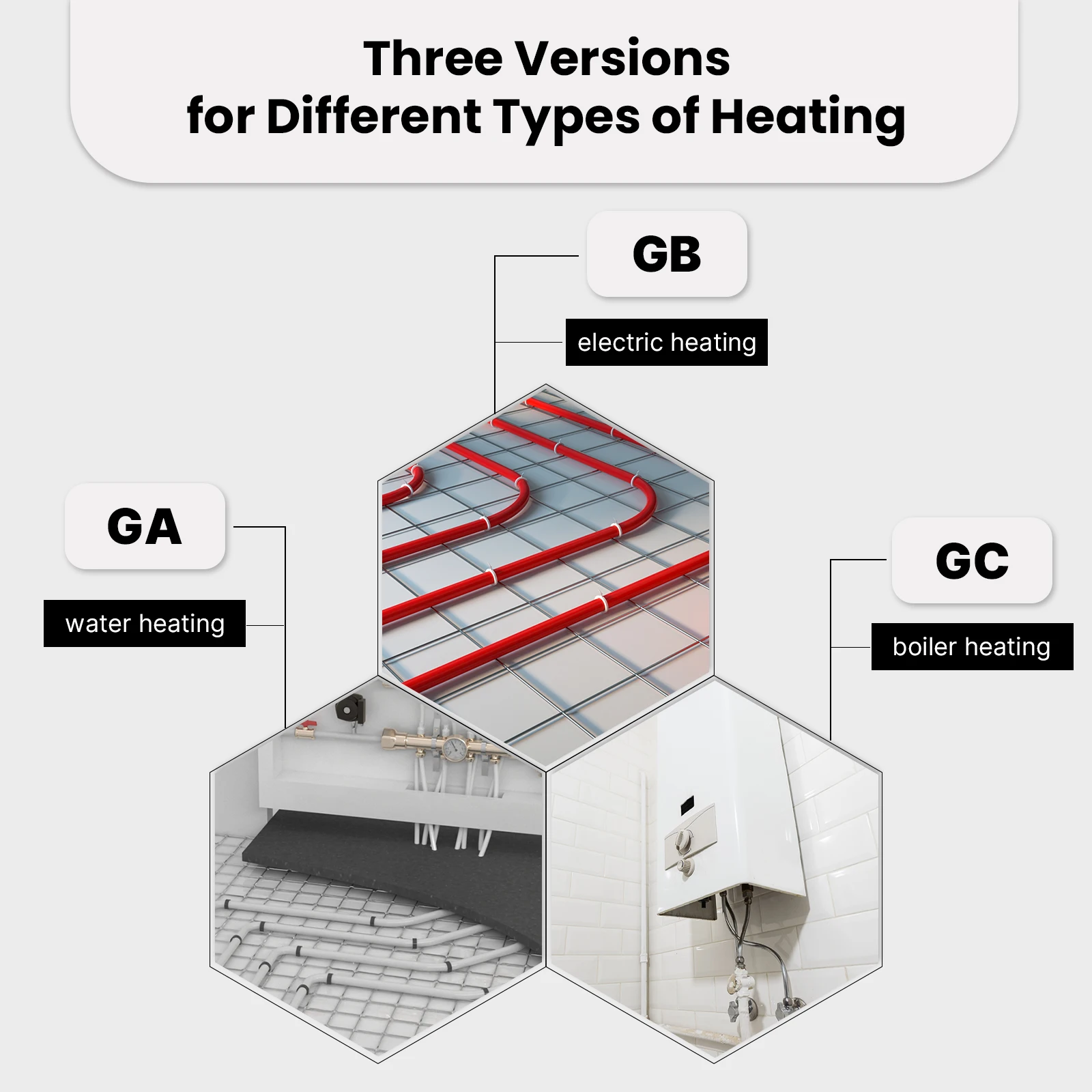 The three products are designed for different heating methods: water heating, electric heating, and boiler. Please choose the corresponding GA, GB, or GC thermostat according to your home heating method.