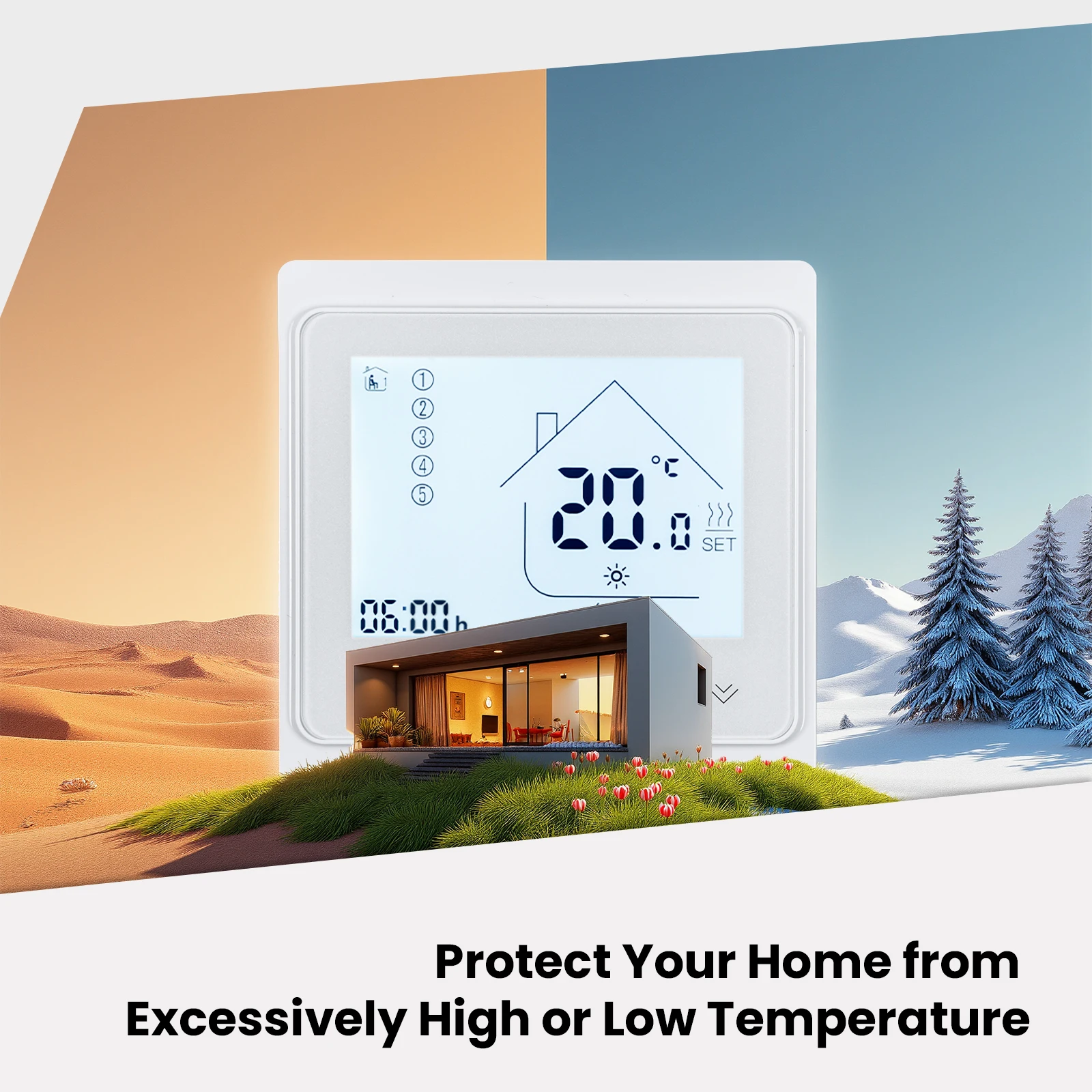 After the high temperature protection function is turned on, when the temperature reaches the set peak, the thermostat will automatically close to protect the safety of the temperature control system and the family; When the low temperature protection function is turned on, the thermostat will automatically turn on when the temperature is too low to ensure that your home is maintained at a suitable and safe temperature.