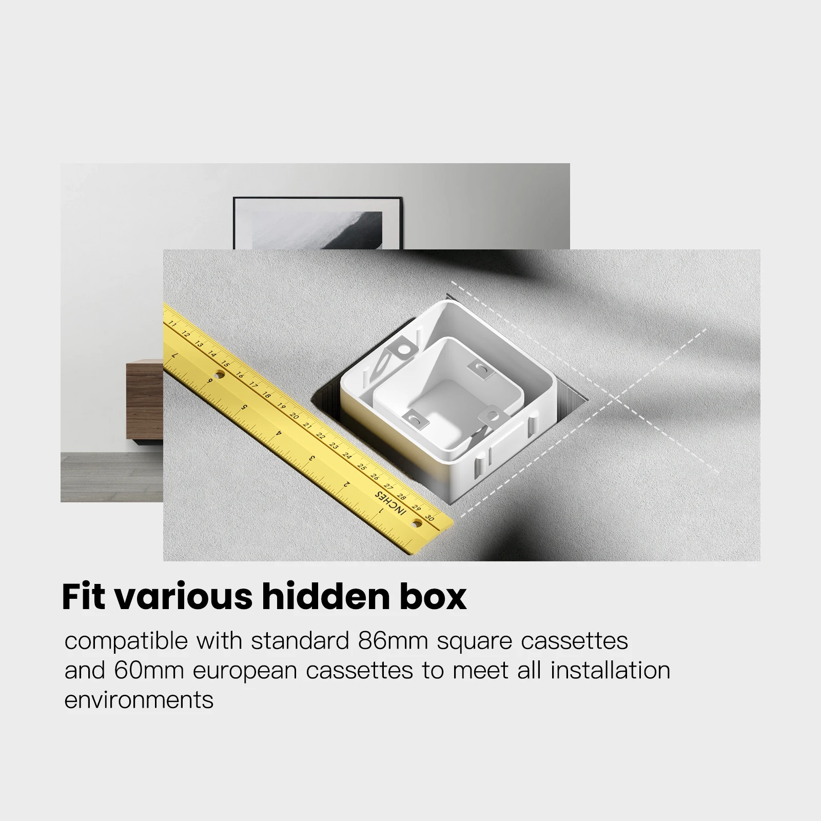 The compact size makes it easy to install in the different sizes of hidden box such as 86mm square cassettes and 60mm European round cassettes.