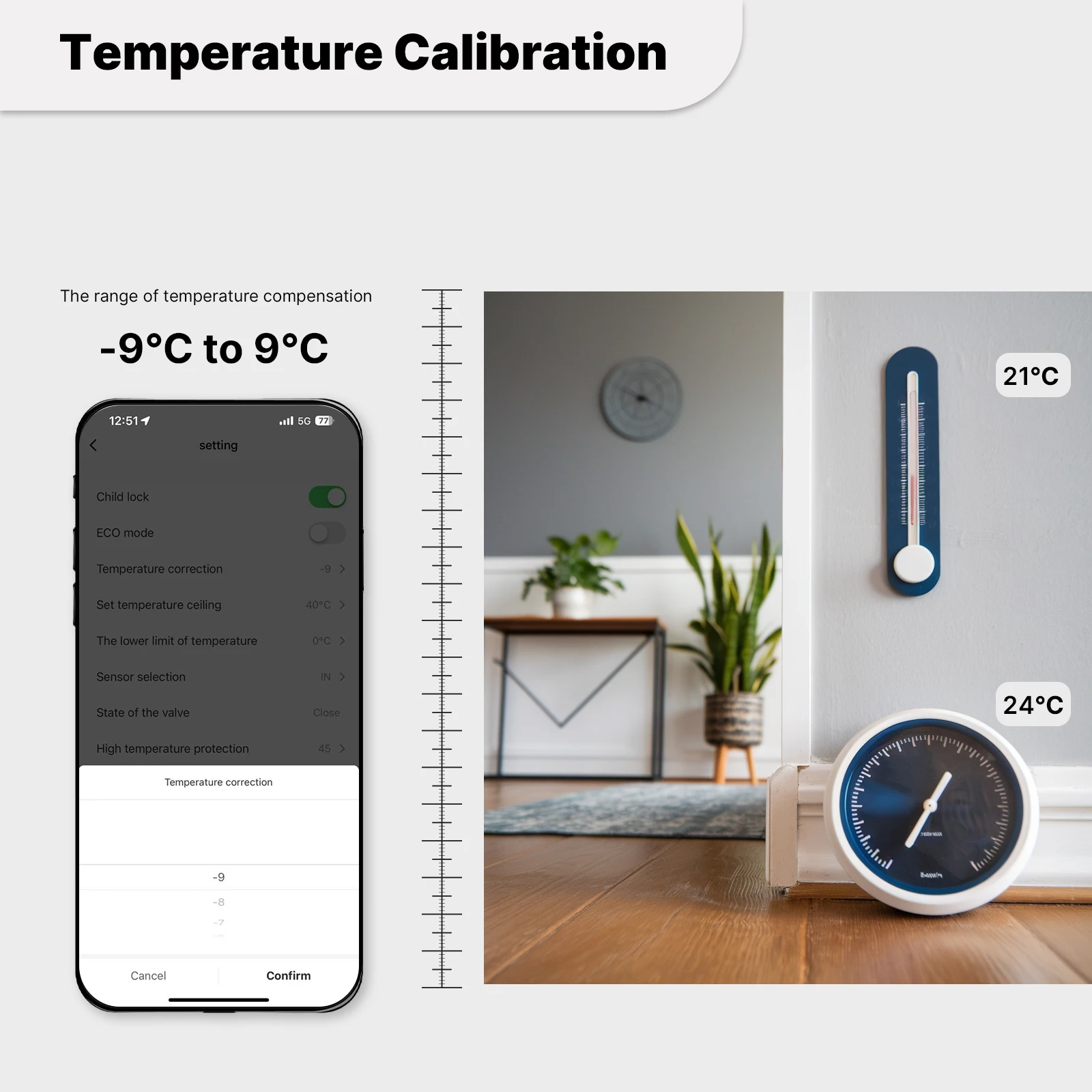 In case of the temperature variation between the floor and the air, you can set the calibration value by App, to make sure the final temperature reaches your ideal value.